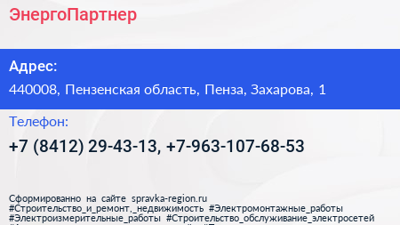 ЭнергоПартнер по адресу 440008, Пензенская область, Пенза, Захарова, 1 в дальнейшем Организация, размещена в следующих категориях: