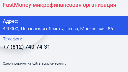 FastMoney, микрофинансовая организация по адресу 440000, Пензенская область, Пенза, Московская, 86 в дальнейшем Организация, размещена в следующих категориях: