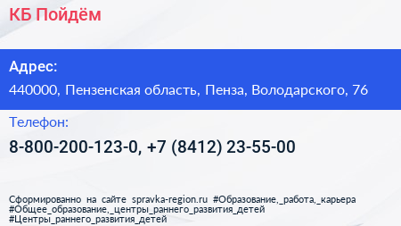КБ Пойдём! по адресу 440000, Пензенская область, Пенза, Володарского, 76 в дальнейшем Организация, размещена в следующих категориях: