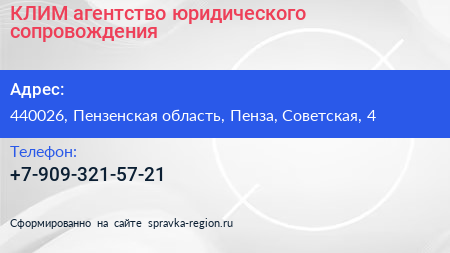 КЛИМ, агентство юридического сопровождения по адресу 440026, Пензенская область, Пенза, Советская, 4 в дальнейшем Организация, размещена в следующих категориях: