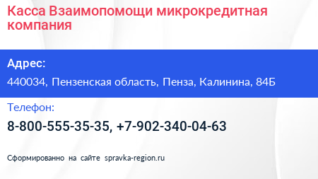 Касса Взаимопомощи, микрокредитная компания по адресу 440034, Пензенская область, Пенза, Калинина, 84Б в дальнейшем Организация, размещена в следующих категориях: