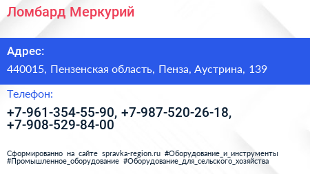 Ломбард Меркурий по адресу 440015, Пензенская область, Пенза, Аустрина, 139 в дальнейшем Организация, размещена в следующих категориях: