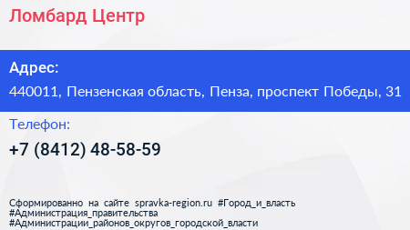 Ломбард-Центр по адресу 440011, Пензенская область, Пенза, проспект Победы, 31 в дальнейшем Организация, размещена в следующих категориях: