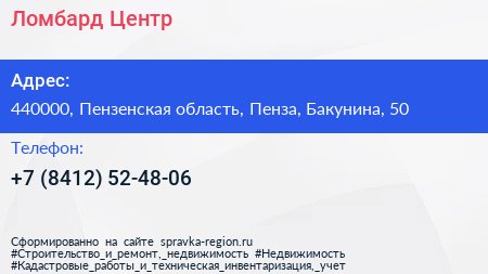 Ломбард-Центр по адресу 440000, Пензенская область, Пенза, Бакунина, 50 в дальнейшем Организация, размещена в следующих категориях: