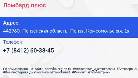 Ломбард плюс по адресу 442960, Пензенская область, Пенза, Комсомольская, 1а в дальнейшем Организация, размещена в следующих категориях: