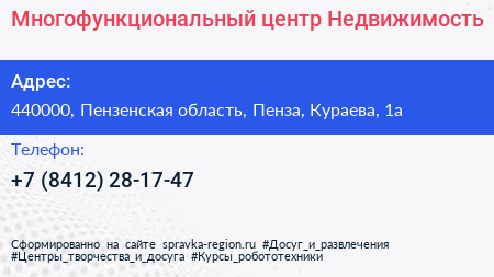 Многофункциональный центр Недвижимость по адресу 440000, Пензенская область, Пенза, Кураева, 1а в дальнейшем Организация, размещена в следующих категориях: