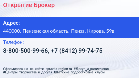 Открытие Брокер по адресу 440000, Пензенская область, Пенза, Кирова, 59в в дальнейшем Организация, размещена в следующих категориях: