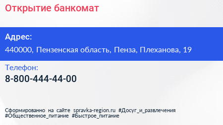 Открытие, банкомат по адресу 440000, Пензенская область, Пенза, Плеханова, 19 в дальнейшем Организация, размещена в следующих категориях:
