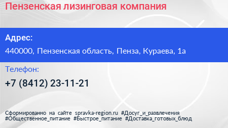 Пензенская лизинговая компания по адресу 440000, Пензенская область, Пенза, Кураева, 1а в дальнейшем Организация, размещена в следующих категориях: