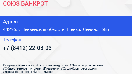 СОЮЗ-БАНКРОТ по адресу 442965, Пензенская область, Пенза, Ленина, 58а в дальнейшем Организация, размещена в следующих категориях: