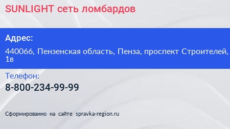 SUNLIGHT, сеть ломбардов по адресу 440066, Пензенская область, Пенза, проспект Строителей, 1в в дальнейшем Организация, размещена в следующих категориях: