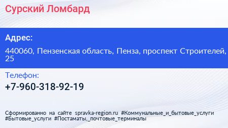 Сурский Ломбард по адресу 440060, Пензенская область, Пенза, проспект Строителей, 25 в дальнейшем Организация, размещена в следующих категориях: