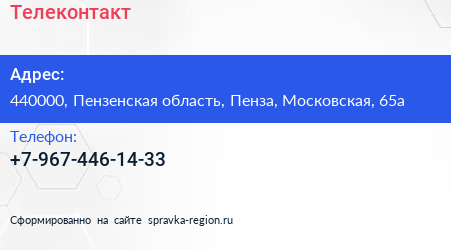 Телеконтакт по адресу 440000, Пензенская область, Пенза, Московская, 65а в дальнейшем Организация, размещена в следующих категориях:
