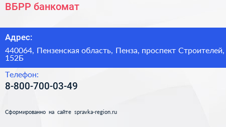 ВБРР, банкомат по адресу 440064, Пензенская область, Пенза, проспект Строителей, 152Б в дальнейшем Организация, размещена в следующих категориях: