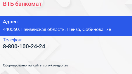 ВТБ, банкомат по адресу 440060, Пензенская область, Пенза, Собинова, 7е в дальнейшем Организация, размещена в следующих категориях: