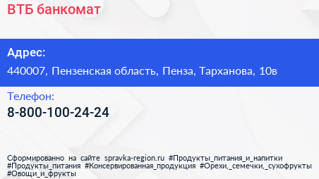 ВТБ, банкомат по адресу 440007, Пензенская область, Пенза, Тарханова, 10в в дальнейшем Организация, размещена в следующих категориях:
