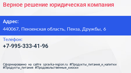Верное решение, юридическая компания по адресу 440067, Пензенская область, Пенза, Дружбы, 6 в дальнейшем Организация, размещена в следующих категориях: