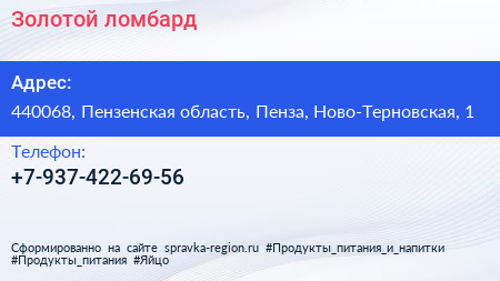 Золотой ломбард по адресу 440068, Пензенская область, Пенза, Ново-Терновская, 1 в дальнейшем Организация, размещена в следующих категориях: