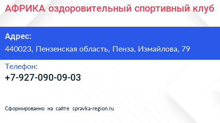 АФРИКА, оздоровительный спортивный клуб по адресу 440023, Пензенская область, Пенза, Измайлова, 79 в дальнейшем Организация, размещена в следующих категориях: