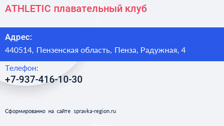 ATHLETIC, плавательный клуб по адресу 440514, Пензенская область, Пенза, Радужная, 4 в дальнейшем Организация, размещена в следующих категориях:
