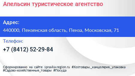 Апельсин, туристическое агентство по адресу 440000, Пензенская область, Пенза, Московская, 71 в дальнейшем Организация, размещена в следующих категориях: