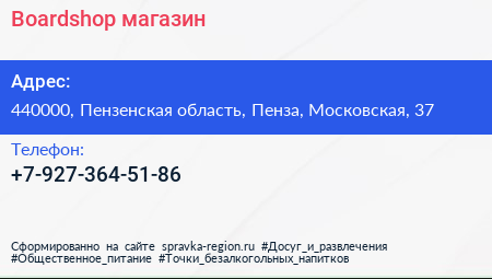 Boardshop, магазин по адресу 440000, Пензенская область, Пенза, Московская, 37 в дальнейшем Организация, размещена в следующих категориях: