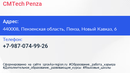 CMTech. Penza по адресу 440008, Пензенская область, Пенза, Новый Кавказ, 6 в дальнейшем Организация, размещена в следующих категориях: