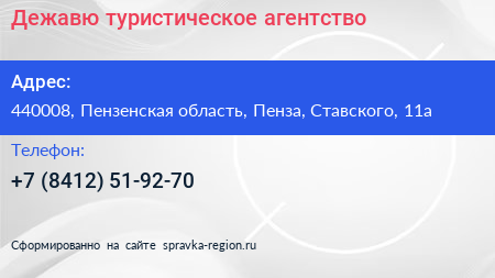 Дежавю, туристическое агентство по адресу 440008, Пензенская область, Пенза, Ставского, 11а в дальнейшем Организация, размещена в следующих категориях: