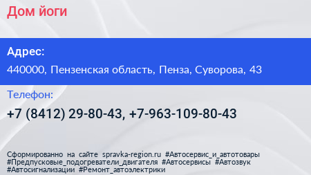 Дом йоги по адресу 440000, Пензенская область, Пенза, Суворова, 43 в дальнейшем Организация, размещена в следующих категориях: