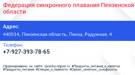 Федерация синхронного плавания Пензенской области по адресу 440514, Пензенская область, Пенза, Радужная, 4 в дальнейшем Организация, размещена в следующих категориях: