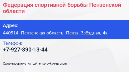 Федерация спортивной борьбы Пензенской области по адресу 440514, Пензенская область, Пенза, Звёздная, 4а в дальнейшем Организация, размещена в следующих категориях: