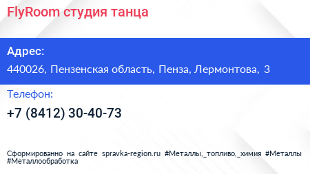 FlyRoom, студия танца по адресу 440026, Пензенская область, Пенза, Лермонтова, 3 в дальнейшем Организация, размещена в следующих категориях: