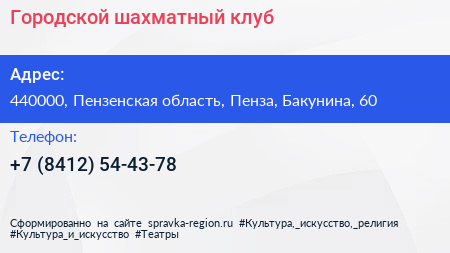 Городской шахматный клуб по адресу 440000, Пензенская область, Пенза, Бакунина, 60 в дальнейшем Организация, размещена в следующих категориях: