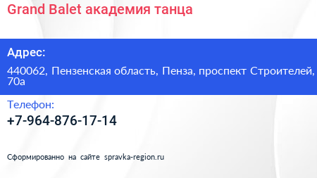 Grand Balet, академия танца по адресу 440062, Пензенская область, Пенза, проспект Строителей, 70а в дальнейшем Организация, размещена в следующих категориях: