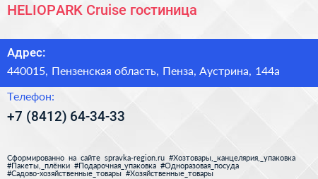 HELIOPARK Cruise, гостиница по адресу 440015, Пензенская область, Пенза, Аустрина, 144а в дальнейшем Организация, размещена в следующих категориях: