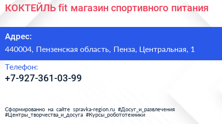 КОКТЕЙЛЬ fit, магазин спортивного питания по адресу 440004, Пензенская область, Пенза, Центральная, 1 в дальнейшем Организация, размещена в следующих категориях: