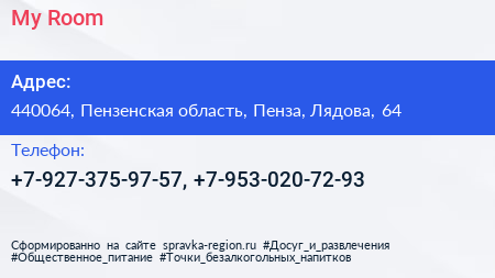 My Room по адресу 440064, Пензенская область, Пенза, Лядова, 64 в дальнейшем Организация, размещена в следующих категориях: