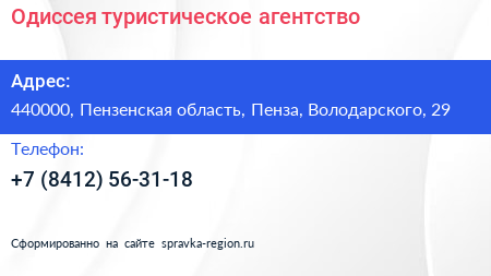 Одиссея, туристическое агентство по адресу 440000, Пензенская область, Пенза, Володарского, 29 в дальнейшем Организация, размещена в следующих категориях: