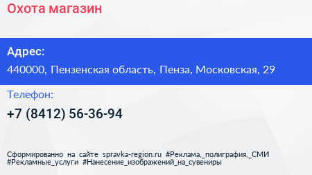 Охота, магазин по адресу 440000, Пензенская область, Пенза, Московская, 29 в дальнейшем Организация, размещена в следующих категориях: