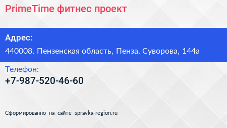PrimeTime, фитнес-проект по адресу 440008, Пензенская область, Пенза, Суворова, 144а в дальнейшем Организация, размещена в следующих категориях: