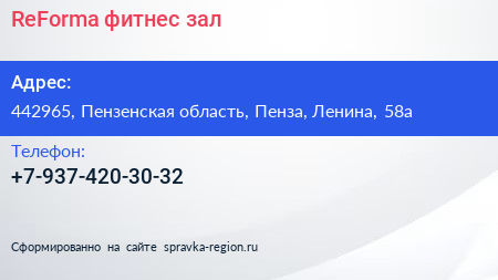 ReForma, фитнес-зал по адресу 442965, Пензенская область, Пенза, Ленина, 58а в дальнейшем Организация, размещена в следующих категориях: