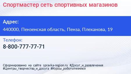 Спортмастер, сеть спортивных магазинов по адресу 440000, Пензенская область, Пенза, Плеханова, 19 в дальнейшем Организация, размещена в следующих категориях: