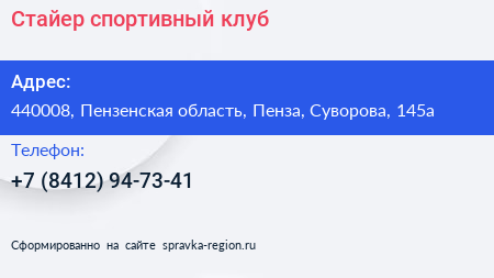 Стайер, спортивный клуб по адресу 440008, Пензенская область, Пенза, Суворова, 145а в дальнейшем Организация, размещена в следующих категориях: