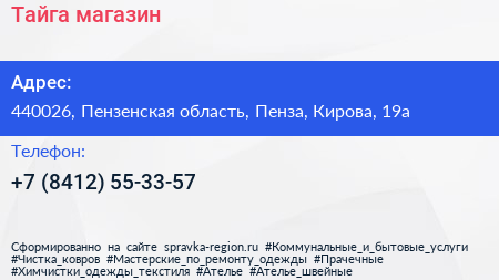 Тайга, магазин по адресу 440026, Пензенская область, Пенза, Кирова, 19а в дальнейшем Организация, размещена в следующих категориях:
