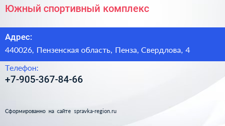 Южный, спортивный комплекс по адресу 440026, Пензенская область, Пенза, Свердлова, 4 в дальнейшем Организация, размещена в следующих категориях: