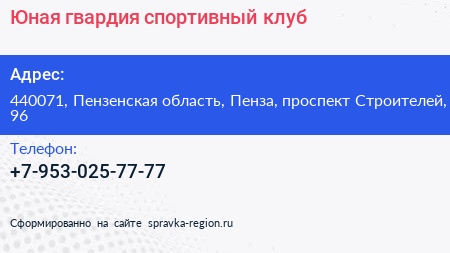 Юная гвардия, спортивный клуб по адресу 440071, Пензенская область, Пенза, проспект Строителей, 96 в дальнейшем Организация, размещена в следующих категориях: