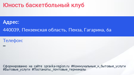 Юность, баскетбольный клуб по адресу 440039, Пензенская область, Пенза, Гагарина, 6а в дальнейшем Организация, размещена в следующих категориях: