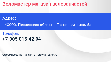 Веломастер, магазин велозапчастей по адресу 440000, Пензенская область, Пенза, Куприна, 5а в дальнейшем Организация, размещена в следующих категориях: