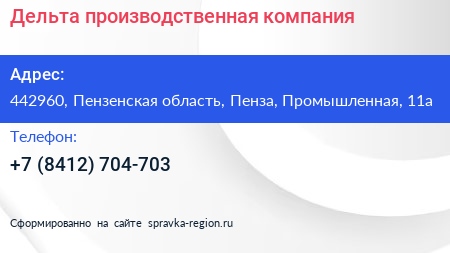 Дельта, производственная компания по адресу 442960, Пензенская область, Пенза, Промышленная, 11а в дальнейшем Организация, размещена в следующих категориях: