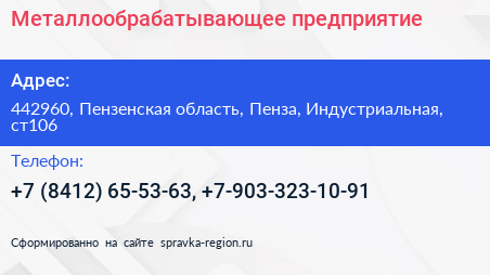 Металлообрабатывающее предприятие по адресу 442960, Пензенская область, Пенза, Индустриальная, ст106 в дальнейшем Организация, размещена в следующих категориях: